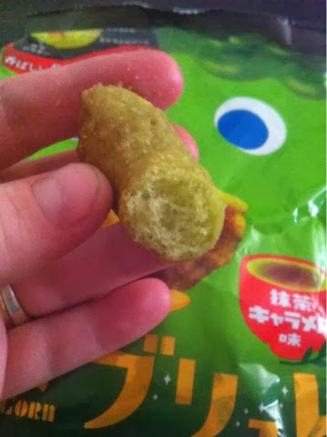 Umaibo is a long tubular corn snack, similar to what Aussies would know of as a "Cheezel" but sweeter. This was broken into 4 pieces inside the pack but I have found them to be somewhat fragile in the past, so it's no wonder. It's probably not a good snack to send internationally because it is easy to break. The flavour was quite cheesy but it also had a sweetness that Western savoury snacks don't have. We all enjoyed this one!